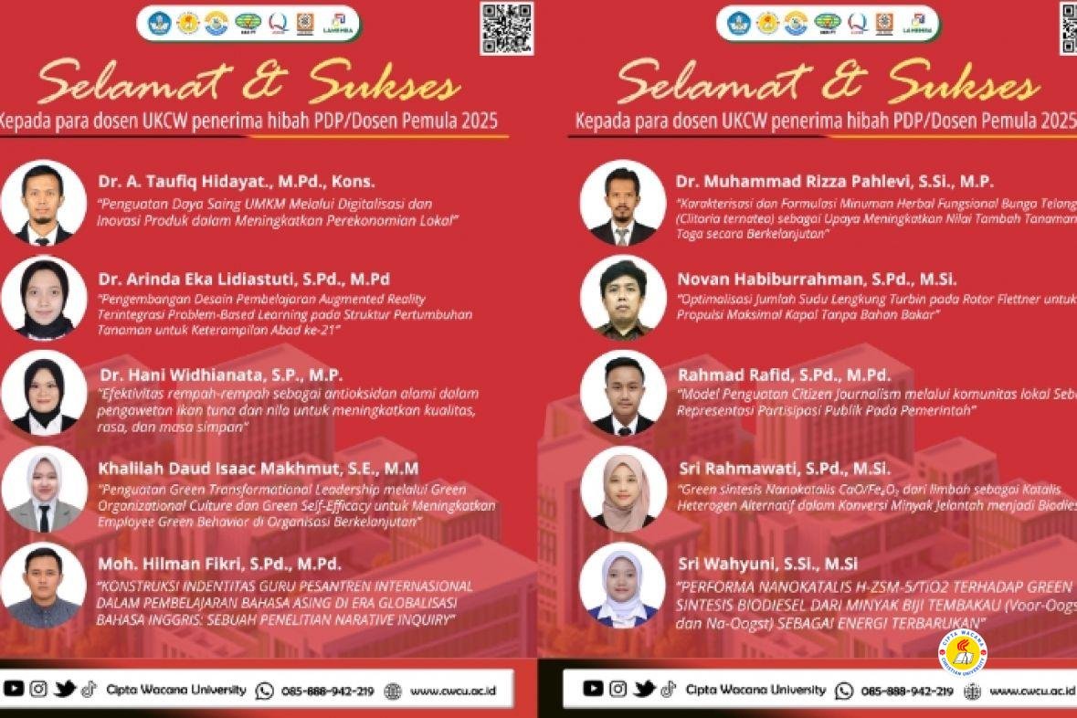 Malang, Mei 2025 — Universitas Kristen Cipta Wacana (UKCW) kembali mencatatkan prestasi membanggakan di kancah nasional melalui keberhasilan sejumlah dosennya dalam memperoleh hibah Program Penelitian Dosen Pemula (PDP) dari Direktorat Riset, Teknologi, dan Pengabdian kepada Masyarakat, Kemendikbudristek RI, untuk Tahun Anggaran 2025.